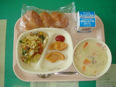 4月19日(火)の給食☆今日の献立☆ ツイストパン、チキンナゲット、キャベツのペペロンチーノ風、クラムチャウダー 今日は1年生が初めての給食でした。おいしく食べられたでしょうか? |