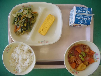 7月2日(月)の給食☆本日の献立☆ ご飯、肉じゃがのトマト煮、厚焼き卵、小松菜とじゃこの炒り煮 肉じゃがのトマト煮は、名前のとおりトマトがたっぷり入っていて、和食と言うよりイタリアンな感じでした。ジャガイモは、はんの木学級の子どもたちが育てたジャガイモも入っています。新じゃがですね。 |
