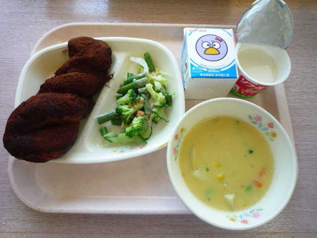 (献立) ココア揚げパン グリーンサラダ コーンスープ ヨーグルト 牛乳 (コメント) グリーンサラダにはインゲンも入っていました。 揚げパンのココアの厚さが今日は半端なかったです。 ヨーグルトは、フタを開けて撮ってみました。 |