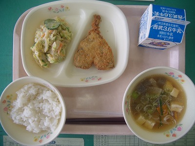 4月23日(月)の給食☆本日の献立☆ ご飯、あじフライ、ゴマネーズ和え、吉野汁 あじフライは、よく揚がっていて、しっぽ?までカリカリと食べられました。身も、結構肉厚で、ふっくらとしていました。魚が苦手な子も、しっかり食べて欲しいです。 |