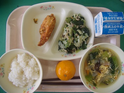 6月28日(水)の給食☆本日の献立☆ ご飯、ユーリンチー、青菜とキノコのソテー、かふうスープ、冷凍ミカン 油淋鶏(ユーリンチー)、カリッと揚がっていて、ネギソースがとてもよく合いました。ご飯がよりおいしく感じます。 |