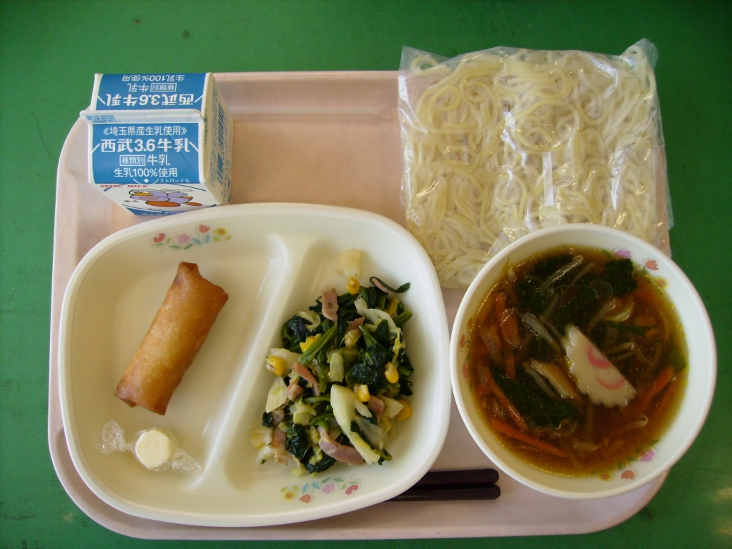 今日の献立 牛乳、しょうゆラーメン、春巻き ほうれん草のソテー、チーズ 今日は暑かったので、さっぱりとしたしょうゆラーメンが おいしかったようです。残りはほとんどなしで、うれしいです。 しっかり食べて、暑さに負けないようにしてもらいたいです。 |