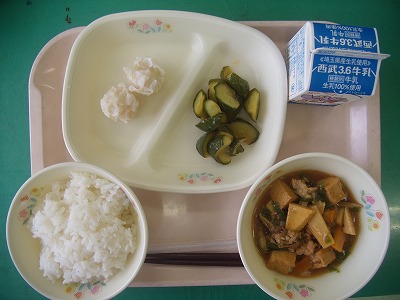 5月25日(木)の給食☆本日の献立☆ ご飯、ジャーチャン豆腐、エビシュウマイ、キュウリのピリッと漬け 梅雨の走りでしょうか?少々肌寒い今日のような日には、ピリ辛料理で、体の中から温まりたいですね。温かいジャーチャン豆腐が、うれしかったです。 |