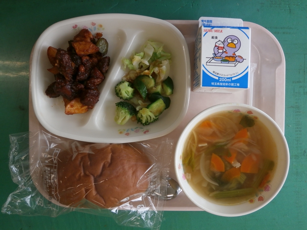 ☆今日の献立☆  牛乳、黒パン、オニオンスープ 豚肉のマリアナソース、グリーンサラダ 今日はほとんどのクラスが完食していました。 少しスープが残ったくらいでした。 黒パンもふわふわしておいしかったです。 マリアナソースは、豚肉の角切りと、豚レバーをしょうゆ、しょうが、 酒で下味をして、かたくり粉をまぶしてかりっと揚げました。 ケチャップ、ウスターソースをべースに作ったソースで和えました。 そのほか、素揚げしたじゃがいも、ピーマンも入りました。 レバーも、血抜きをして、ゆでて、下味をして揚げます。 この一手間で、苦手なレバーも食べやすくなります。 豚肉のマリアナソースの残りはゼロでした。 |