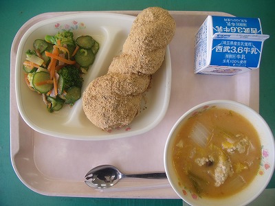 3月13日(火)の給食☆本日の献立☆ 黒ごまきなこあげパン、和風サラダ、キムチ鍋スープ 子ども達も大好きなあげパン。黒ごまきなこがついていて、余計においしいでしょう。黒ごまきなこがあまったので、牛乳に入れて飲みました。 |