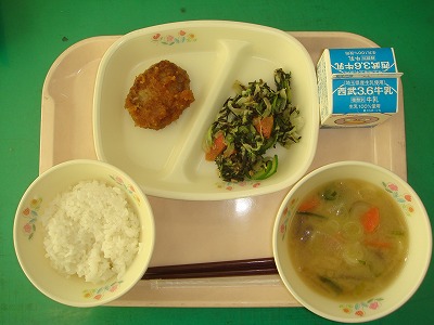 11月9日(水)の給食☆本日の献立☆ ご飯、おろしハンバーグ、ひじきサラダ、重忠汁 川本の郷土料理、重忠汁が出ました。団子が入っていて、野菜もたっぷりで、ボリュームのある汁です。 |
