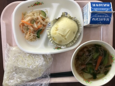 本日の給食で登場している石垣団子は、神奈川県相模原地域に伝わる郷土料理です。小麦粉の生地にさつまいもを入れて蒸したもので、さつまいもをサイコロ状に切ったものが生地からみえ、まるで石垣のように見えることからこの名前がついたと言われています。
