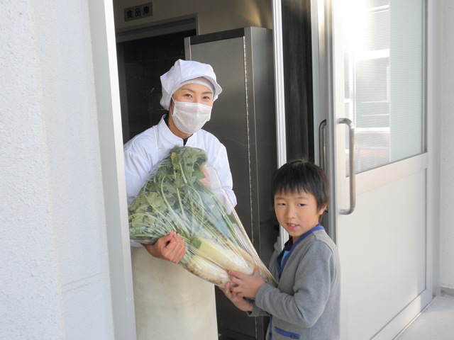 調理員さんに渡して、おいしく調理してもらいます。 今日の、ねぎまうどんに入ります。 甘みを増して、おいしくなった大根を全校でいただきます!! 今月は、「地産地消」推進月間。 地元で採れた野菜を、たくさん食べましょう。