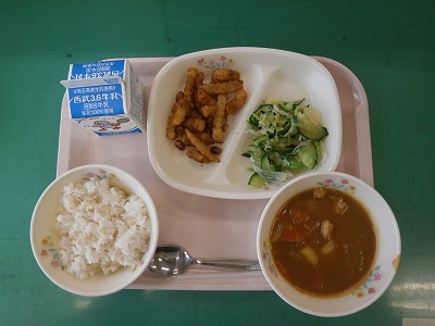 5月27日(金)の給食☆今日の献立☆ 発芽玄米入りご飯、ポークカレー、大豆とポテトの揚げ煮、温野菜 蒸し暑い日にはカレーで食欲を増して、栄養を付けましょう! |