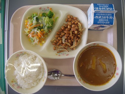 5月25日(金)の給食☆本日の献立☆ ご飯、チキンカレーのルー、大豆とゴボウのカリカリ揚げ、三色サラダ 大豆とゴボウのカリカリ揚げ、おいしいのですが、噛むのが結構大変で、食べにくそうでした。あごにはいいのかもしれませんね。カレーは、あじもとろみもとっても良かったです。 |