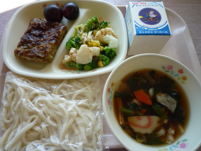 (献立) 肉うどん お好み焼き 花野菜サラダ 巨峰 牛乳 (コメント) 今月の給食目標は、「好き嫌いなく何でも食べよう」です。 私は、今月も完食を目指します。 お好み焼きを箸で持ち上げるとかなりの重量感がありました。 実際に定規で測りましたら、2㎝ありました。 魚のすり身などが混ぜ込んでありました。 |