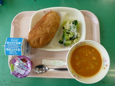 10月25日(火)の給食☆本日の献立☆ きな粉揚げパン、メキシカンシチュー、グリーンサラダ、グレープゼリー 子どもたちは揚げパンが大好きです。ちょっと食べるのに工夫がいりますが… |