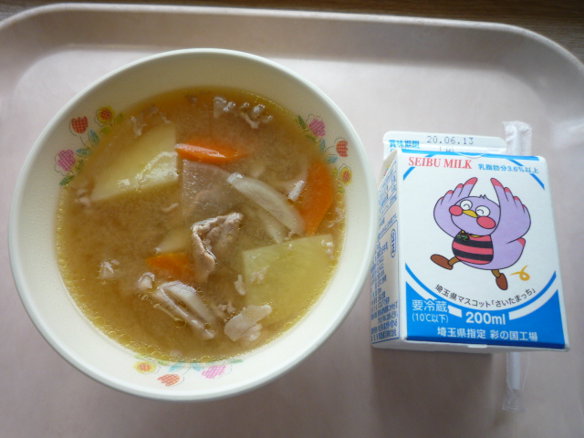 今日は具沢山豚汁と牛乳の献立です。 久々の給食に皆喜んでいました。 |
