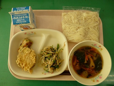 11月2日(水)の給食☆本日の献立☆ 麺、天ぷらうどんの汁、さつまいも天、ちくわ天、ほうれん草の和え物 今日も野菜たっぷりの給食でした。風邪予防にも野菜はいいといわれています。 |