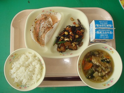 9月9日(金)の給食☆本日の献立☆ ご飯、サケのめんたいマヨ焼き、大豆の磯煮、けんちん汁 スパゲティでも定番の、めんたいマヨ味。サケにもよく合いました。 |