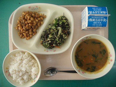 1月18日(木)の給食☆本日の献立☆ 麦ご飯、スピナッチカレー、大豆のシャリシャリ揚げ、ツナとひじきのサラダ スピナッチとは、ほうれん草のことです。カレールーに、柔らかくて甘いほうれん草が入っていました。ルーはさらっとしていますが、コクがありました。 |
