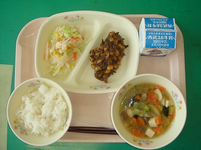 6月20日(月)の給食☆本日の献立☆ ご飯、ソイ丼の具、たくあんサラダ、やさい椀 今日は野菜たっぷりのヘルシーメニューです。大豆でタンパク質もとれますね。 |