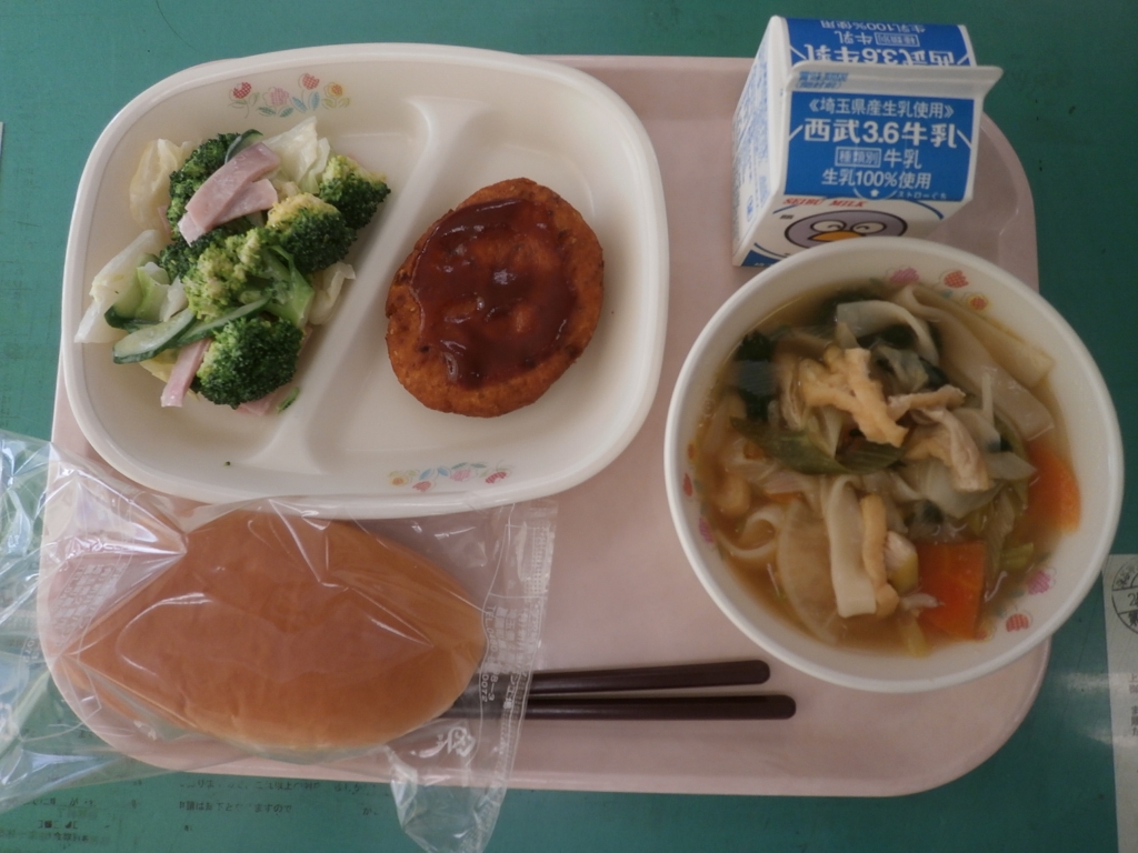 牛乳、たまごパン、煮ぼうとう ゼリーフライ、ブロッコリーサラダ
