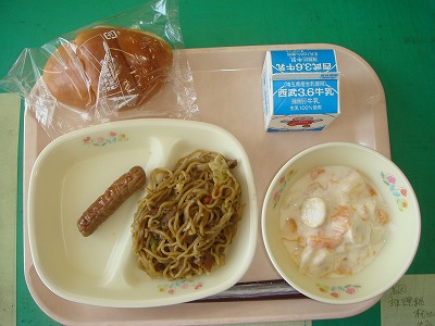 4月26日(火)の給食☆今日の献立☆ バターロール、ソース焼きそば、焼きウインナー、ヨーグルト和え フルーツたっぷりのヨーグルト和え、デザートにぴったりです。 |