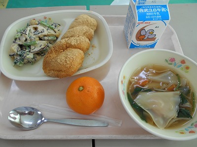 11月20日(火)の給食☆本日の献立☆ きなこあげパン、彩の国サラダ、ワンタンスープ、ミカン あげパンはおいしいのですが、食べるのに苦労します。ですが、苦労して食べることで、食べ方を学んでいくのでしょうね。 |
