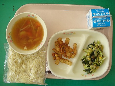2月22日(水)の給食☆本日の献立☆ 麺、生碼麺のスープ、大豆とポテトの揚げ煮、海藻サラダ 生碼麺は、しゃきしゃきした野菜を載せた麺という意味らしいです。確かにもやしがしゃきしゃきしていました。 |