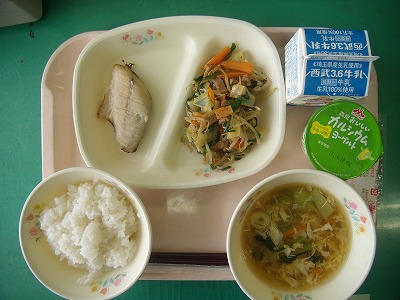 4月17日(月)の給食☆本日の献立☆ ご飯、鰆の西京焼き、野菜炒め、かき玉汁、ヨーグルト 鰆の西京焼き。ちょっと骨がありましたが、上手に取って食べられたでしょうか?魚には骨があるということ?を学ぶのも、食育の一環です。ご家庭の魚料理はいかがでしょうか? |