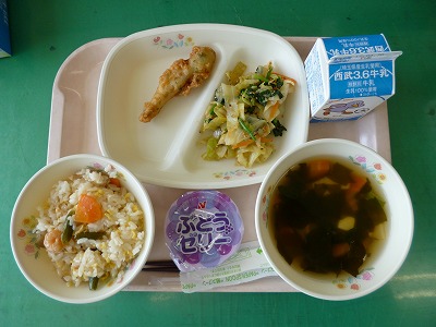 4月20日(木)の給食☆本日の献立☆ 五目寿司、ワカサギフリッター、胡麻和え、若竹汁、ブドウゼリー 具だくさんの五目寿司。酢の加減もちょうどよく、おいしくいただきました。今日のような暑い日は、デザートのゼリーもうれしいです。 |