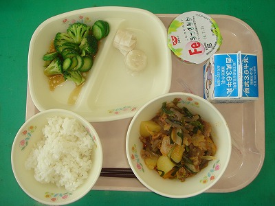 7月13日(水)の給食☆本日の献立☆ ご飯、じゃが豚キムチ、エビシュウマイ、温野菜、ヨーグルト 暑さが続き、少々ばて気味の体には、豚キムチがカツを入れてくれそうです。ピリ辛で、おいしくいただきました。 |