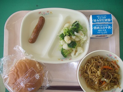 6月20日(火)の給食☆本日の献立☆ こどもパン、焼きそば、焼きウインナー、花野菜サラダ 焼きそばは、そのまま食べてもよし、パンにはさんで食べてもよし、どっちにしてもおいしいですね。 |