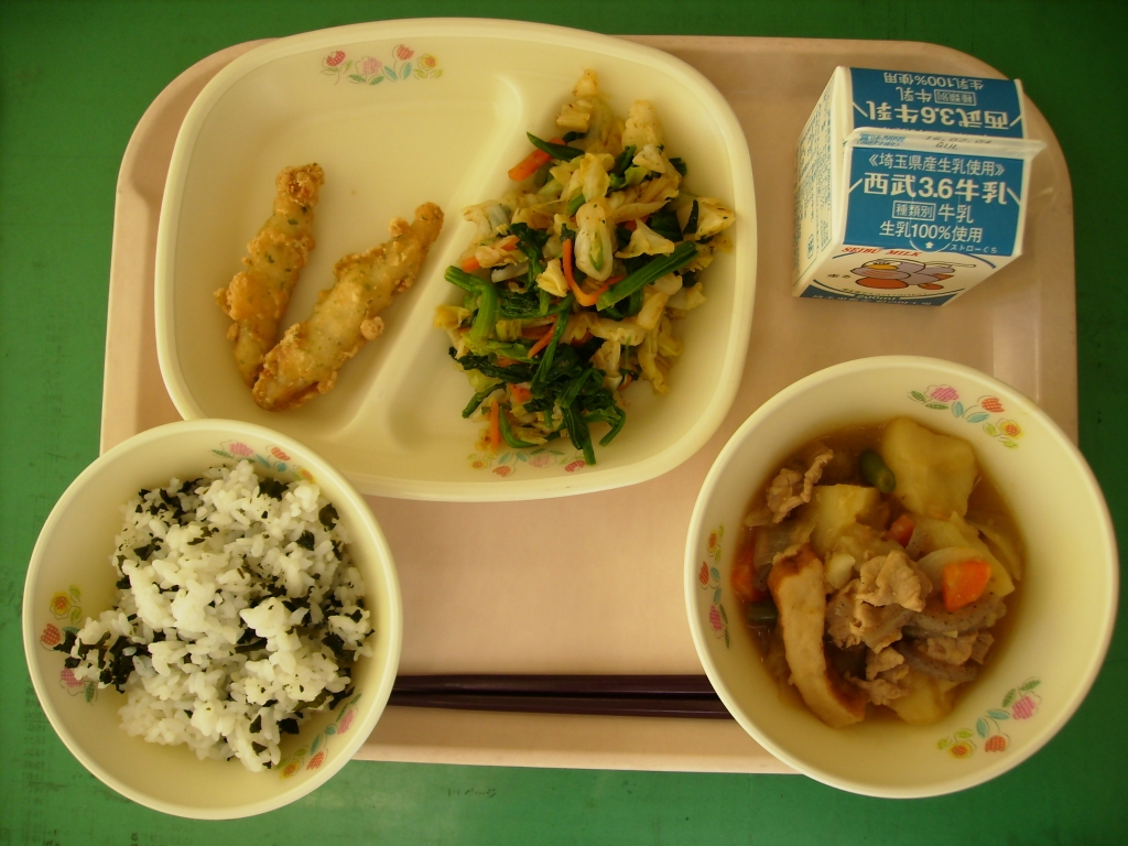 牛乳、わかめごはん、肉じゃが ワカサギフリッター、おひたし