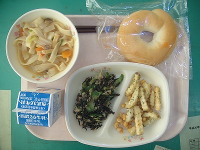 1月29日(火)の給食☆本日の献立☆ バターリングパン、煮ぼうとう、大豆とポテトあげ、ツナとひじきのサラダ 今日は主食が二つあるくらいに見えるボリュームたっぷりの献立でした。休み時間にサッカーや縄跳びで一敗遊んだ子にも、満足できる内容でしょう。