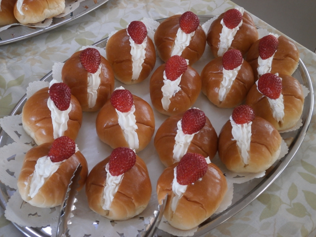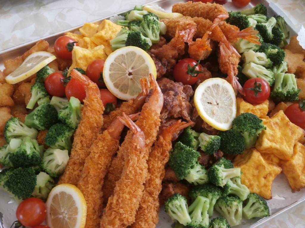 えびフライ、唐揚げ、オムレツ、ポテトなどのおかずが並びました。
