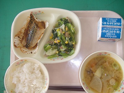 5月28日(月)の給食☆本日の献立☆ ご飯、サバのソース焼、青菜のソテー、野菜椀 サバは、味はいいけどにおいが…という人もいると思います。子どももそうかもしれません。それでも、何とか青魚を食べてもらおうと、味付けに工夫をしています。ソース焼もその一つです。子どもたちは気に入ってくれたでしょうか? |