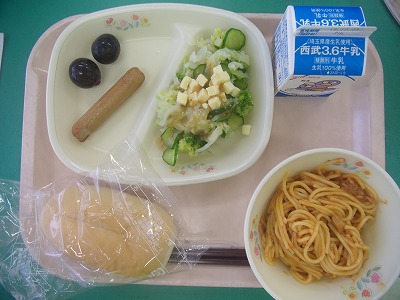9月25日(火)の給食☆本日の献立☆ ソフトフランスパン、トンノスパゲッティ、焼フランク、チーズサラダ、果物(巨峰) トンノスパゲッティのトンノとは、マグロのことだそうです。いわゆるツナのことですね。トマト味にコクが出て、とてもおいしかったです。 |
