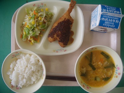 6月28日(木)の給食☆本日の献立☆ ご飯、あじフライ、野菜炒め、豚キムチスープ あじフライは、結構肉厚で、ふっくらと揚がっていました。とてもおいしかったです。調理員さんの揚げ方が上手だったのでしょう、と栄養士が言っていました。揚げ方で、味も変わるものなのですね。 |