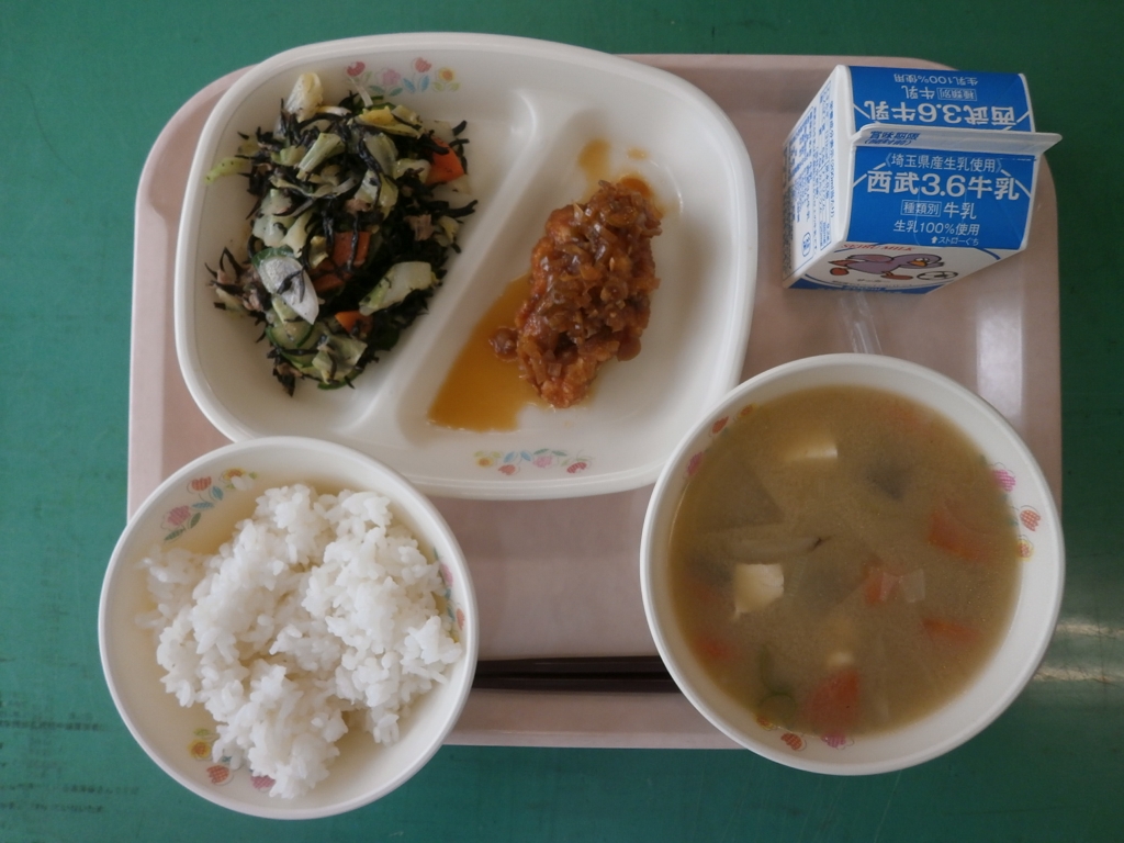今日は揚げた鶏肉に、にんにく、しょうが、ねぎ しょうゆ、酢、砂糖、ごま油を煮立てて作った タレを上からかけました。 ツナとひじきのサラダは子どもたちに人気のサラダです。 みそ汁も具だくさんでおいしかったです。 子どもたちもよく食べました。 |