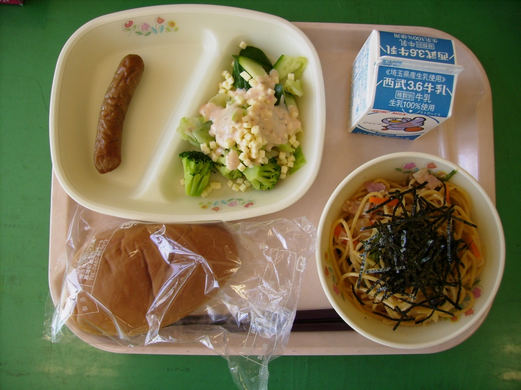 ☆今日の献立☆  牛乳、くろパン、森のきのこのスパゲッティ 焼きフランク、チーズサラダ 今日は秋の味覚、きのこをたっぷり使ったスパゲッティでした。 きのこも3種類、しめじ、えのきたけ、エリンギを使いました。 味付けは、コンソメ、しょうゆ、塩、こしょうの和風です。 各クラスで、刻みのりをトッピンてもらいました。 |