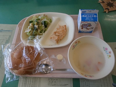 5月22日(火)の給食☆本日の献立☆ フラワーパン、鶏肉のレモン焼、グリーンサラダ、クラムチャウダー、チーズ 袋を開けてみると、花のような形をしているフラワーパン。見た目でも楽しませてくれました。鶏肉のレモン焼は、レモン風味でさっぱりいただけました。