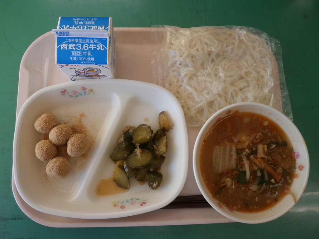 牛乳、キムチ入りごまみそラーメン 白玉団子のきな粉和え、きゅうりのナムル