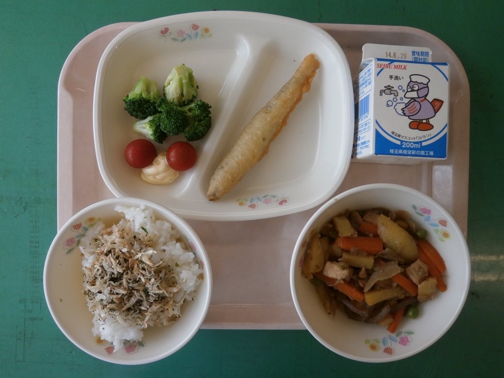 ☆今日の献立☆  牛乳、ごはん、手作りふりかけ、 じゃがいものきんぴら煮 ししゃもフリッター、野菜の付け合わせ 今日はカルシウムたっぷりのメニューでした。 骨ごと食べられるししゃもに、 ふりかけにはじゃこや桜えびなどの乾物が入りました。 カルシウムも汗などと一緒に体の外に排出されてしまいがちです。 積極的に食べるようにしましょう!! |