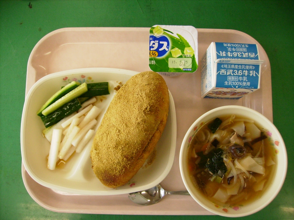 | | 2015/05/12 | 5月12日の給食~抹茶きな粉揚げパン |  | by:栄養士 |