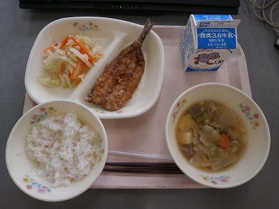 6月21日(木)の給食☆本日の献立☆ ご飯、イワシの蒲焼き、たくあんサラダ、豚汁 |