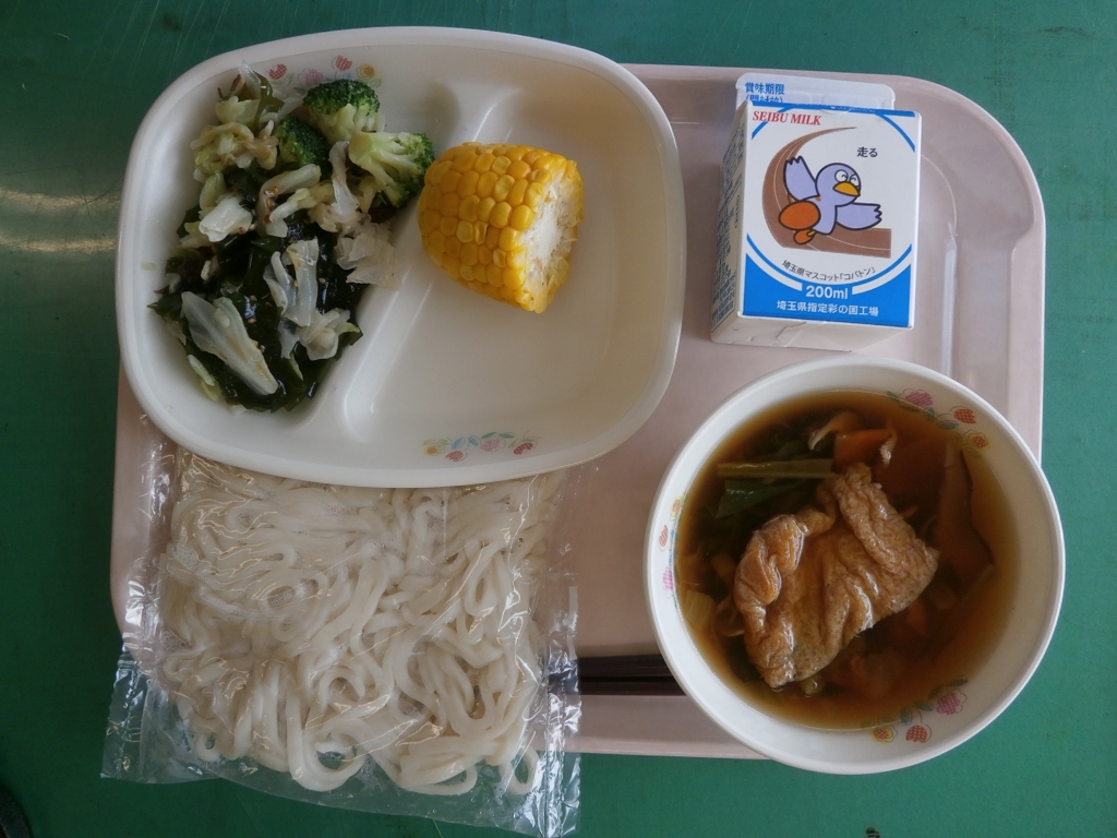 牛乳、きつねうどん、カットコーン、海草サラダ