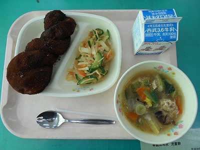 2月12日(火)の給食☆本日の献立☆ ココアあげパン、和風和え、白菜と肉団子のスープ 12日は6年生が社会科見学でした。大好きなココアあげパンが食べられなくて、残念そうでした。 |