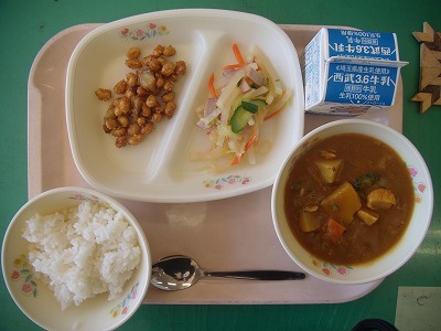 ご飯、チキンカレー、大豆のしゃりしゃり揚げ、ハムと大根のサラダ