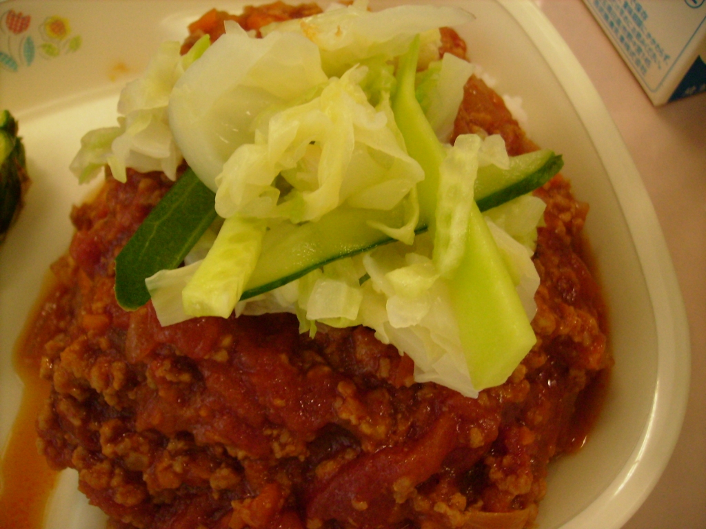 牛乳、タコライス(ごはん、ミートソース、キャベツ)