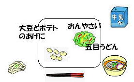 10月26日(水)の給食☆本日の献立☆(都合で写真が撮れませんでしたので、盛りつけ表を載せました。) うどん、五目うどんの汁、大豆とポテトの揚げ煮、温野菜 最近は野菜が高いらしいのですが、給食にはほとんど毎日野菜が出るのでありがたいです。 |