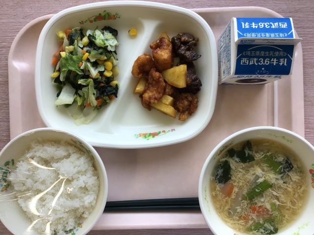 鶏肉とじゃがいもの香味揚げ・ほうれん草とコーンのソテー・かき玉汁