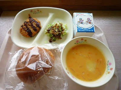 (メニュー) コロッケサンド ゆでキャベツ 豆乳キャロットスープ 牛乳 (食レポ) スープは豆乳が入っている分、色がマイルドです。 コロッケとキャベツのどちらにもソースをかけていただきました。 |