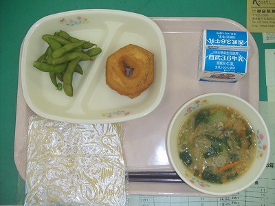 6月20日(水)の給食☆本日の献立☆ ラーメン、担々麺スープ、たまごドーナツ、枝豆 暑い日と寒い日が交互にやってきているような最近の天候です。今日も寒かったので、ラーメンがおいしかったです。たまごドーナツも、カリッと揚がっていて、甘く、とてもおいしかったです。 |